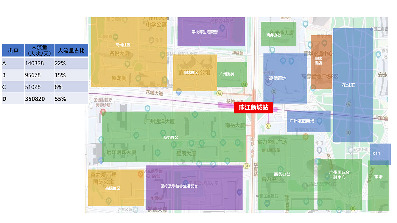 该广告牌位广州天河区珠江新城D口花城广场出入口处,是珠江新城CBD人流最密集最核心交通出入口,珠江新城是广东著名CBD商务区,汇聚诸多高档写字楼酒店、金融机构、豪宅楼盘,广告周边有花城广场、花城汇、高德置地广场、广州国际金融中心、周大福金融中心、K11广场、友谊商场、广州政务中心、广东省博物馆、广州大剧院、广州图书馆、广州少年宫、花城广场、海心沙、广州塔、合景国际金融广场、富力中心、富力盈凯广场、南岳大厦、侨鑫国际金融中心、雅居乐中心、珠江投资大厦、国门酒店、卓美亚酒店、广州妇幼儿童医院、全球通大厦、美国领事馆和地铁珠江新城站等。珠江新城CBD被誉为广州新城名片,广州城市会客厅,环境优美,地标景观林立、汇聚来自世界游客,商业氛围浓厚。珠江新城是广州人流最大地铁3号线与5号线交汇换乘站,广告地处珠江新城最繁华地铁出入口,是品牌宣传的理想位置,是品牌在广州品牌宣传非常难得黄金理想阵地。